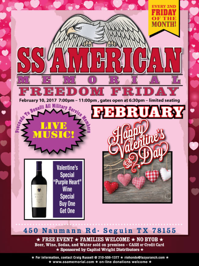 FEBRUARY 10th – Freedom Friday – Valentine’s Day celebration – bring your sweetheart and purchase her a bottle of “PURPLE HEART” wine. Two bottles for the price of one special.