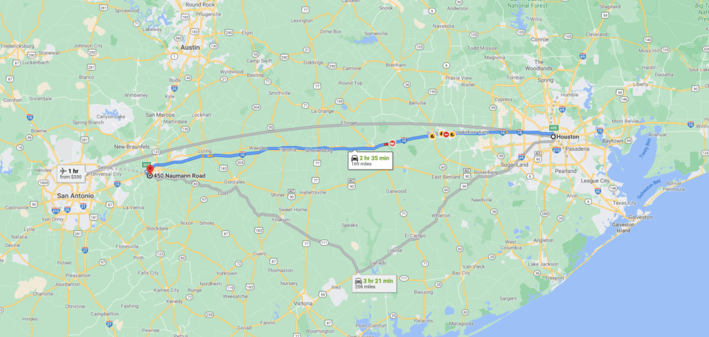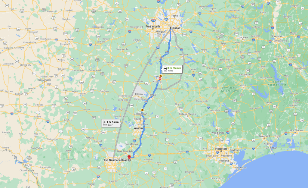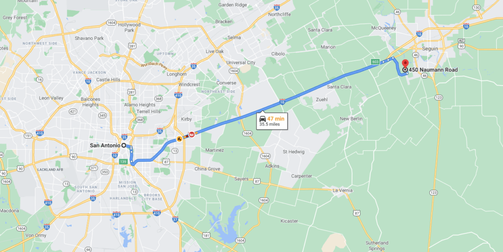 Take I-130 Toll Road South of Waco to Seguin, Texas. In Sequin, take IH-10 West towards San Antonio.